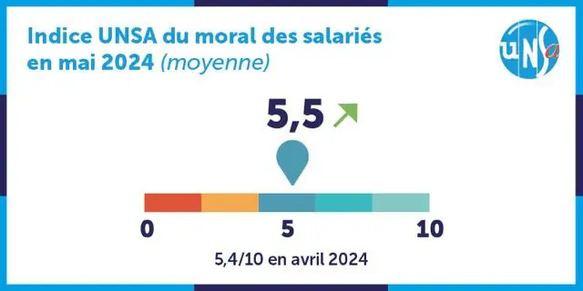 Le moral des salariés reste bas Indice UNSA du moral des salariés - Mai 2024 Une très légère augmentation de l’indice du moral des salariés en ce mois de mai 2024 qui passe de 5,5 sur 10 contre 5,4 en avril.